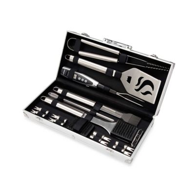 Cuisinart 20 piece bbq grilling kit, stainless steel. The cuisinart 20 piece deluxe grill set provides you with all the essential grilling tools and also includes a bonus digital temperature fork! Chef's spatula, grill tongs, silicone basting brush, cleaning brush, extra cleaning brush head, 8 (4 pair) corn holders everything stores conveniently in aluminum carry case. Durable set of stainless steel tools. For example, the perforated spatula is designed with a serrated edge, ideal for cutting, flipping, and serving foods.